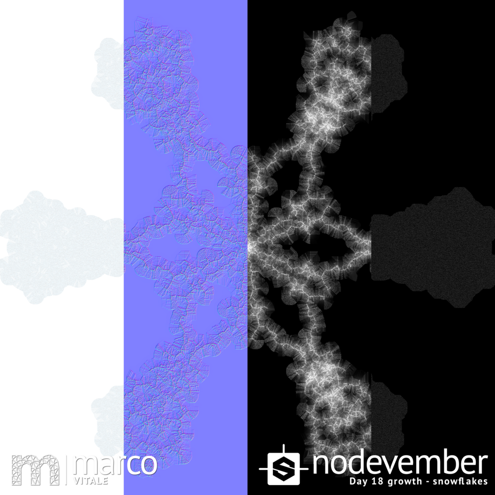 A procedural Snowflake Material, based on the Coding Challenge #127: Brownian Tree Snowflake (https://youtu.be/XUA8UREROYE) by Daniel Shiffman made 100% in Substance Designer. This should be my entry for Nodevember Day 18 - Growth, but I couldn't make it in time.