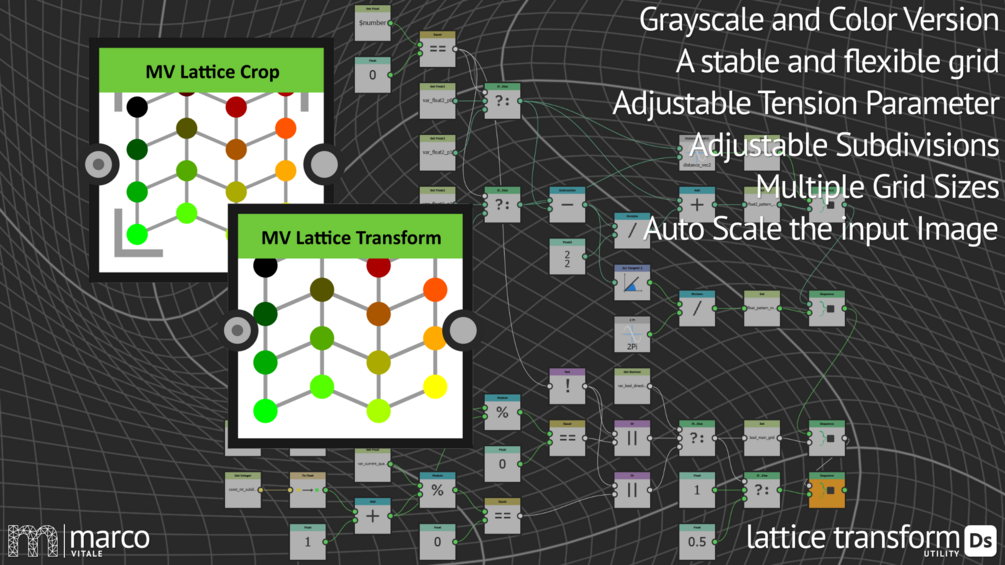 The Lattice Transform - Utilities is a collection of tools to bend, crop and transform any input image by using a lattice of 12 Points. The input image gets interpolated between the lattice points using Catmull-Rom Splines to get smooth continous UVs.