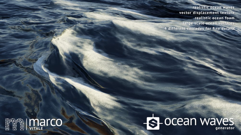 This material created in Substance Designer (optimized for the Metallic/Roughness Workflow) allows you to create unique fully customized Ocean Waves Texture to fit exaclty your needs. This material has over 40 exposed parameters, to give you as much freedom as possible. For more information ArtStation - Ocean Waves - Generator